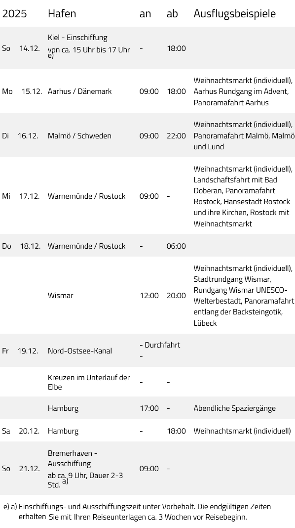 Für eine Kreuzfahrt ab einem deutschen Hafen ist es ungewöhnlich, dass weitere deutsche Hafenstädte als Ausflugsziel angelaufen, doch auf dieser MS Amadea Adventskreuzfahrt nach Dänemark vom 14. Dezember 2025 bis 21. Dezember 2025 laden die historischen Altstädte von Rostock, Wismar und Hamburg zur Besichtigung und ein.
