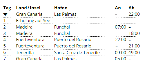 Gran Canaria Der Kreuzfahrthafen Las Palmas liegt auf der Kanarischen Insel Gran Canaria. Die Insel ist in ihrem Inneren noch sehr ursprünglich. Kleine Bergdörfer, die man auf Serpentinenstraßen erreichen kann und die atemberaubende Ausblicke in tiefe Schluchten gewähren, Wanderwege durch vulkanisch geprägte Bergregionen und freundliche Menschen finden sich hier. In den Küstenregionen lassen sich Spaziergänge in der Meeresbrandung, eine Golfpartie auf gepflegten Golfplätzen oder der Besuch der Hauptstadt Las Palmas unternehmen, die in ihrem alten Zentrum zahlreiche historische Gebäude zeigt.