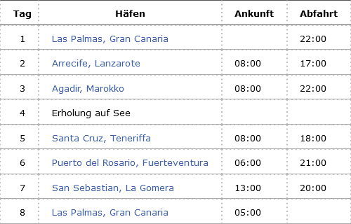 Gran Canaria Der Kreuzfahrthafen Las Palmas liegt auf der Kanarischen Insel Gran Canaria. Die Insel ist in ihrem Inneren noch sehr ursprünglich. Kleine Bergdörfer, die man auf Serpentinenstraßen erreichen kann und die atemberaubende Ausblicke in tiefe Schluchten gewähren, Wanderwege durch vulkanisch geprägte Bergregionen und freundliche Menschen finden sich hier. In den Küstenregionen lassen sich Spaziergänge in der Meeresbrandung, eine Golfpartie auf gepflegten Golfplätzen oder der Besuch der Hauptstadt Las Palmas unternehmen, die in ihrem alten Zentrum zahlreiche historische Gebäude zeigt.