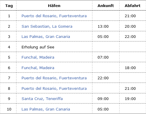 Gran Canaria Der Kreuzfahrthafen Las Palmas liegt auf der Kanarischen Insel Gran Canaria. Die Insel ist in ihrem Inneren noch sehr ursprünglich. Kleine Bergdörfer, die man auf Serpentinenstraßen erreichen kann und die atemberaubende Ausblicke in tiefe Schluchten gewähren, Wanderwege durch vulkanisch geprägte Bergregionen und freundliche Menschen finden sich hier. In den Küstenregionen lassen sich Spaziergänge in der Meeresbrandung, eine Golfpartie auf gepflegten Golfplätzen oder der Besuch der Hauptstadt Las Palmas unternehmen, die in ihrem alten Zentrum zahlreiche historische Gebäude zeigt.
