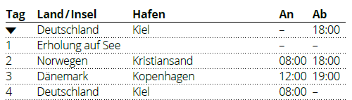 Kiel (Deutschland) Der neue Kieler Kreuzfahrtterminal ist das Tor zur Stadt und Region Kiel, die mit der Kieler Fjorde, den nahen Ostseestränden und dem Nord-Ostsee-Kanal einige schöne Ausflugsziele bietet. Der Terminal liegt zentral in der Stadtmitte nur wenige Meter vom Hauptbahnhof entfernt und von dort aus lassen sich schöne Spaziergänge durch die schleswig-holsteinische Hauptstadt und ihren schönen Fähr-, Segel- und Kreuzfahrthafen unternehmen. |