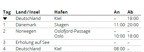| Dauer | Schiff | Reiseroute | Abreisen |