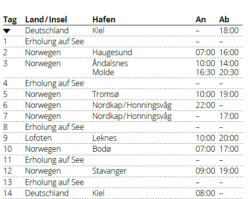 Kreuzfahrt Norwegen mit Lofoten & Nordkap ab Kiel: Kiel, Haugesund (Norwegen), Andalsnes (Norwegen), Molde (Norwegen), Tromsö (Norwegen), Honningsvag (Nordkap), Leknes (Lofoten), Bodo (Norwegen), Stavanger (Norwegen), Kiel