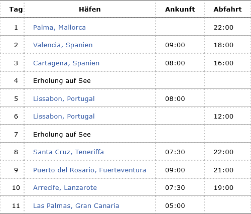 Kreuzfahrt Spanien, Portugal & Kanaren ab Mallorca 1: Palma de Mallorca, Valencia (Spanien), Cartagena (Spanien), Lissabon (Portugal), Santa Cruz (Teneriffa), Fuerteventura, Lanzarote, Las Palmas (Gran Canaria)