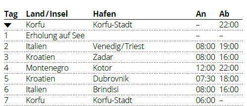 AIDA Kreuzfahrt 1 Woche mit der AIDAblu auf der Route 'Adria ab Korfu 1'. AIDAblu Reisen am 12.06.2027, 24.07.2027, 04.09.2027 & 25.09.2027 für je 7 Tage. AIDAblu ab 12. Juni 2027, 24. Juli 2027, 04. September 2027 und 25. September 2027 im Mittelmeer ab/bis Korfu