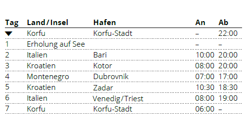 Eine Mittelmeerkreuzfahrt durch die bezaubernde Adria ab der griechischen Insel Korfu und wieder zurück, das bietet das schmucke Kussmundschiff AIDAblu im Sommer 2026 an. Dabei werden Sie u.a. die interessanten italienischen Hafenstädt Triest und Bari sowie die kroatischen Adriastädte Dubrovnik und Zadar anlaufen und einen Abstecher nach Kotor in Montenegro machen. Freuen Sie sich auf spannende Landgänge, bei denen Sie viel über die abwechselungsreiche Vergangenheit und über die blühende Kunst und Kultur rund um die Adria erfahren werden. Und für ausgedehnte Stadtbesichtigungen eignet sich gerade diese noch nicht so heiße Reisezeit während dieser AIDAblu Adria ab Korfu ab dem 30. Mai 2026.