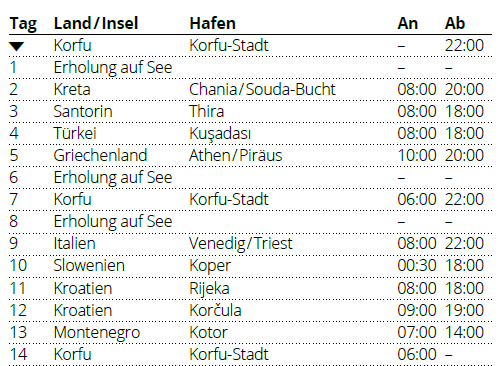 Kreuzfahrt Adria & Griechenland ab Korfu 1: Insel Korfu, Souda Bay (Kreta), Insel Santorin, Kusadasi (Türkei), Athen (Griechenland), Insel Korfu, Triest (Italien), Koper (Slowenien), Rijeka (Kroatien), Korcula (Kroatien), Kotor (Montenegro), Insel Korfu