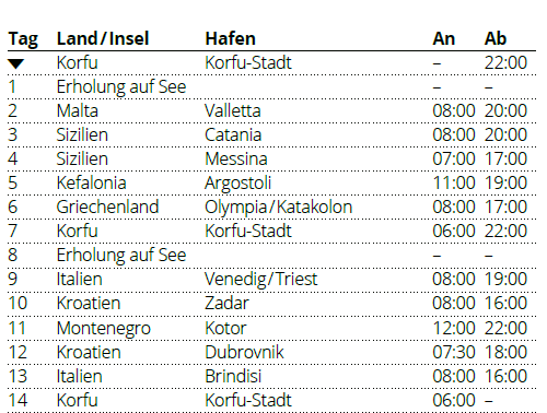 Kreuzfahrt Adria & Mittelmeerinseln ab Korfu: Insel Korfu, Insel Malta, Catania (Sizilien), Messina (Sizilien), Argostoli (Kefalonia), Katakolon (Griechenland), Korfu (Griechenland), Triest (Italien), Zadar (Kroatien), Kotor (Montenegro), Dubrovnik (Kroatien), Brindisi (Italien), Korfu (Griechenland)