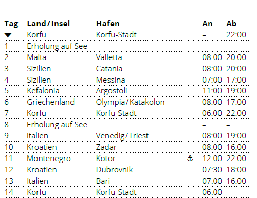 Kreuzfahrt Adria & Mittelmeerinseln ab Korfu: Insel Korfu, La Valletta (Malta), Catania (Sizilien), Messina (Sizilien), Argostoli (Griechenland), Katakolon (Griechenland), Insel Korfu, Triest (Italien), Koper (Slowenien), Rijeka (Kroatien), Korcula (Kroatien), Kotor (Montenegro), Korfu