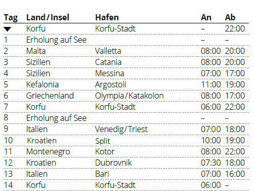 Kreuzfahrt Adria & Mittelmeerinseln ab Korfu: Insel Korfu, La Valletta (Malta), Catania (Sizilien), Messina (Sizilien), Argostoli (Griechenland), Katakolon (Griechenland), Insel Korfu, Triest (Italien), Split (Kroatien), Kotor (Montenegro), Dubrovnik (Kroatien), Bari (Italien), Korfu