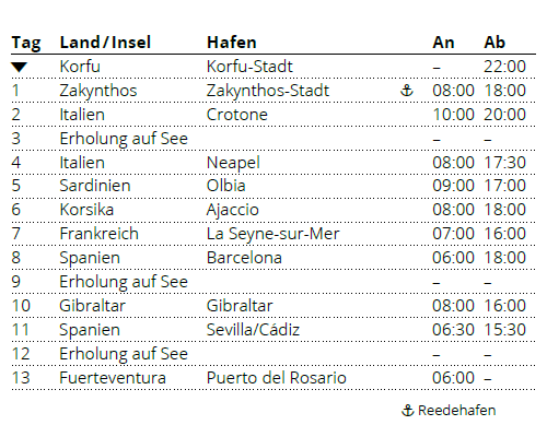 Kreuzfahrt Griechenland, Andalusien & Kanaren ab Korfu 2: Korfu (Griechenland), Zakynthos (Griechenland), Crotone (Italien), Neapel (Italien), Olbia (Sardinien), Ajaccio (Korsika), La Seyne-sur-Mer (Frankreich), Barcelona (Spanien), Gibraltar, Cadiz (Spanien), Puerto del Rosario (Fuerteventura)