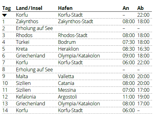 Kreuzfahrt Griechenland & Mittelmeerinseln ab Korfu 2: Insel Korfu, Insel Zakynthos, Insel Rhodos, Bodrum (Türkei), Heraklion (Kreta), Katakolon (Griechenland), Insel Korfu, La Valletta (Malta), Catania (Sizilien), Messina (Sizilien), Argostoli (Griechenland), Katakolon (Griechenland), Korfu