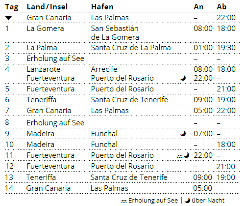 Kreuzfahrt Große Kanaren-Reise mit La Gomera & Madeira: Las Palmas (Gran Canaria), San Sebastian (La Gomera), Santa Cruz (La Palma), Arrecife (Lanzarote), Puerto del Rosario (Fuerteventura), Santa Cruz (Teneriffa), Las Palmas (Gran Canaria), Madeira, Puerto del Rosario (Fuerteventura), Santa Cruz (Teneriffa), Las Palmas (Gran Canaria)