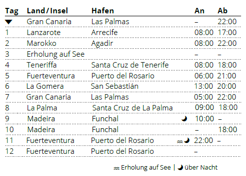 Kreuzfahrt Kanaren, Madeira & Marokko: Las Palmas (Gran Canaria), Arrecife (Lanzarote), Agadir (Marokko), Santa Cruz (Teneriffa), Puerto del Rosario (Fuerteventura), San Sebastian (La Gomera), Las Palmas (Gran Canaria), Santa Cruz (La Palma), Funchal (Madeira), Puerto del Rosario (Fuerteventura)