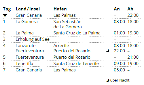 Kreuzfahrt Kanaren mit La Gomera: Las Palmas (Gran Canaria), San Sebastian (La Gomera), Santa Cruz (La Palma), Arrecife (Lanzarote), Puerto del Rosario (Fuerteventura), Santa Cruz (Teneriffa), Las Palmas (Gran Canaria)