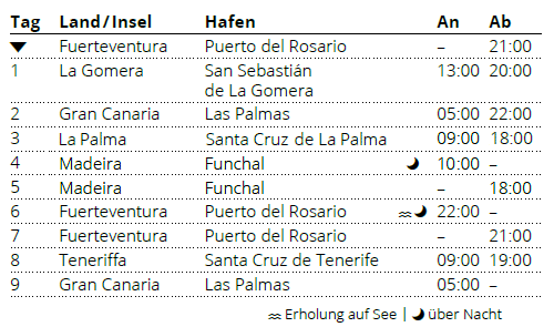 Kreuzfahrt Kanarische Inselwelt & Madeira: Puerto del Rosario (Fuerteventura), San Sebastian (La Gomera), Las Palmas (Gran Canaria), Santa Cruz (La Palma), Funchal (Madeira), Puerto del Rosario (Fuerteventura), Santa Cruz (Teneriffa), Las Palmas (Gran Canaria)
