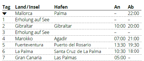 Kreuzfahrt Von Mallorca nach Gran Canaria: Palma de Mallorca, Gibraltar, Agadir (Marokko), Fuerteventura, La Palma, Gran Canaria