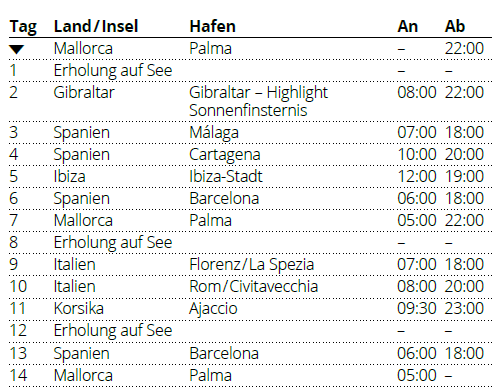 Kreuzfahrt Große Mittelmeer-Reise mit Sonnenfinsternis 2: Palma de Mallorca, Gibraltar, Sonnenfinsternis in Gibraltar, Malaga (Spanien), Cartagena (Spanien), Ibiza, Barcelona (Spanien), Palma de Mallorca, La Spezia (Italien), Civitavecchia (Rom - Italien), Ajaccio (Korsika), Barcelona (Spanien), Palma de Mallorca