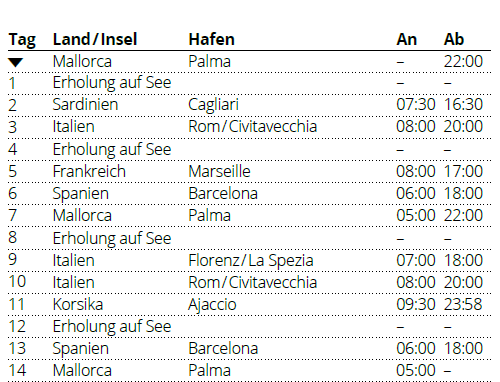 Kreuzfahrt Große Mittelmeer-Reise ab Mallorca 1: Palma de Mallorca (Spanien), La Spezia (Italien), Civitavecchia (Rom - Italien), Ajaccio (Korsika), Barcelona (Spanien), Palma de Mallorca (Spanien), Cagliari (Sardinien), Civitavecchia (Rom - Italien), Marseille (Frankreich), Barcelona (Spanien), Palma de Mallorca