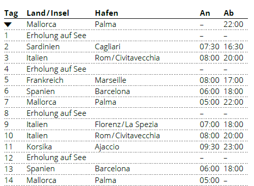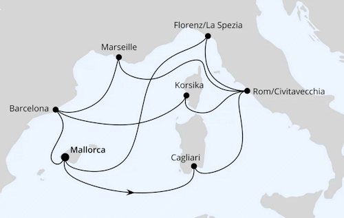 Kreuzfahrt Große Mittelmeerreise ab Mallorca 1: Palma de Mallorca, Cagliari (Sardinien), Civitavecchia (Rom), Marseille (Frankreich), Barcelona (Spanien), Mallorca, La Spezia (Italien), Civitavecchia (Rom), Ajaccio (Korsika), Barcelona (Spanien), Palma de Mallorca