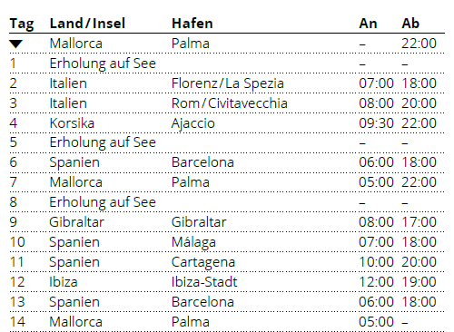 Mallorca ist die Lieblingsurlaubsinsel der Deutschen und bietet von der stimmungsvollen Partymeile bis zur romantischen Finca eine Vielzahl von Reisemöglichkeiten. Für Aida Kreuzfahrten dient der Kreuzfahrthafen von Palma de Mallorca zumeist als Start- oder Zielhafen. Sollten Sie vor Abfahrt oder nach der Ankunft ihres Aida Kreuzfahrtschiffes noch etwas Zeit haben, lohnt sich insbesondere die Besichtigung der Altstadt von Palma de Mallorca, wo der kunstvoll gestaltete Dom, malerische Gässchen und prächtige Residenzen auf Sie warten. Selbstverständlich lassen sich in der Umgebung auch schöne Stunden am Strand verbringen, eine Runde Golf spielen oder man bricht auf zu einem kurzen Ausflug über die Insel, welcher die natürliche Schönheit von Mallorca zeigt.