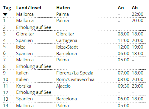 Mallorca ist die Lieblingsurlaubsinsel der Deutschen und bietet von der stimmungsvollen Partymeile bis zur romantischen Finca eine Vielzahl von Reisemöglichkeiten. Für Aida Kreuzfahrten dient der Kreuzfahrthafen von Palma de Mallorca zumeist als Start- oder Zielhafen. Sollten Sie vor Abfahrt oder nach der Ankunft ihres Aida Kreuzfahrtschiffes noch etwas Zeit haben, lohnt sich insbesondere die Besichtigung der Altstadt von Palma de Mallorca, wo der kunstvoll gestaltete Dom, malerische Gässchen und prächtige Residenzen auf Sie warten. Selbstverständlich lassen sich in der Umgebung auch schöne Stunden am Strand verbringen, eine Runde Golf spielen oder man bricht auf zu einem kurzen Ausflug über die Insel, welcher die natürliche Schönheit von Mallorca zeigt.