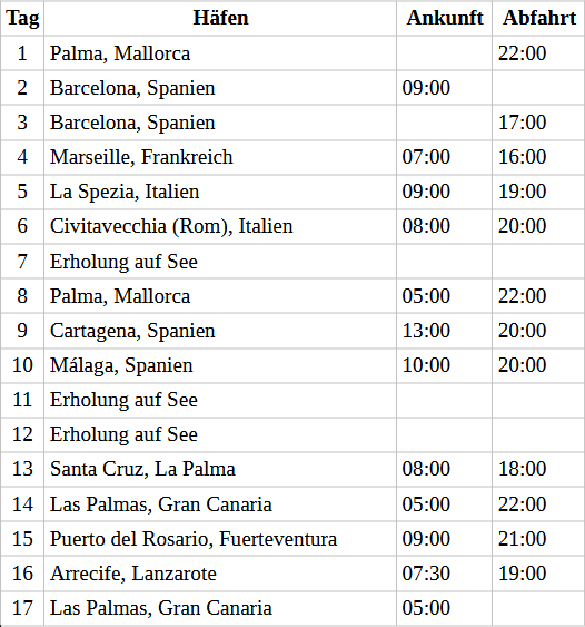 Kreuzfahrt Perlen am Mittelmeer & Kanaren ab Mallorca: Palma de Mallorca, Barcelona (Spanien), Marseille (Frankreich), La Spezia (Italien), Civitavecchia (Rom), Palma de Mallorca, Cartagena (Spanien), Malaga (Spanien), La Palma, Gran Canaria, Fuerteventura, Lanzarote, Las Palmas (Gran Canaria)