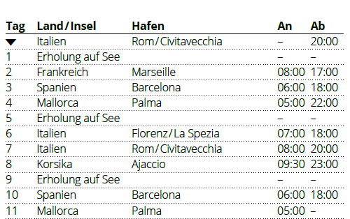 Kreuzfahrt Spanien, Frankreich & Italien ab Civitavecchia: Civitavecchia (Rom - Italien), Ajaccio (Korsika), Barcelona (Spanien), Mallorca, Cagliari (Sardinien), Civitavecchia (Rom - Italien), Marseille (Frankreich), Barcelona (Spanien), Palma de Mallorca