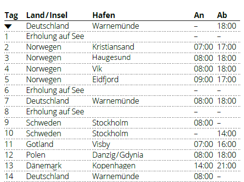 Kreuzfahrt Highlights der Nord- und Ostseeküste 1: Warnemünde (Deutschland), Kristiansand (Norwegen), Haugesund (Norwegen), Vik (Norwegen), Eidfjord (Norwegen), Warnemünde (Deutschland), Stockholm (Schweden), Visby (Gotland), Danzig (Polen), Kopenhagen (Dänemark), Warnemünde