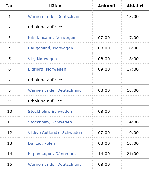 Kreuzfahrt Highlights der Nord- und Ostseeküste 1: Warnemünde (Deutschland), Kristiansand (Norwegen), Haugesund (Norwegen), Vik (Norwegen), Eidfjord (Norwegen), Warnemünde, Stockholm (Schweden), Visby (Gotland), Danzig (Polen), Kopenhagen (Dänemark), Warnemünde