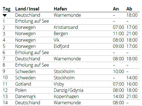 Kreuzfahrt Highlights der Nord- und Ostseeküste 1: Warnemünde, Kristiansand (Norwegen), Bergen (Norwegen), Vik (Norwegen), Eidfjord (Norwegen), Warnemünde, Stockholm (Schweden), Visby (Gotland), Danzig (Polen), Kopenhagen (Dänemark), Warnemünde