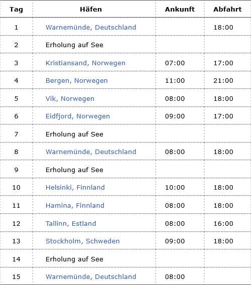 Kreuzfahrt Highlights der Nord- und Ostseeküste 2: Warnemünde (Deutschland), Kristiansand (Norwegen), Bergen (Norwegen), Vik (Norwegen), Eidfjord (Norwegen), Warnemünde (Deutschland), Helsinki (Finnland), Hamina (Finnland), Tallinn (Estland), Stockholm (Schweden), Warnemünde (Deutschland)