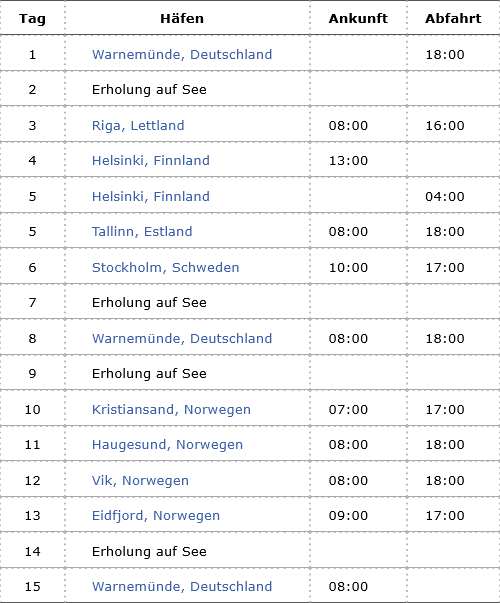 Kreuzfahrt Highlights der Nord- und Ostseeküste 2: Warnemünde (Deutschland), Riga (Lettland), Helsinki (Finnland), Tallinn (Estland), Stockholm (Schweden), Warnemünde, Kristiansand (Norwegen), Haugesund (Norwegen), Vik (Norwegen), Eidfjord (Norwegen), Warnemünde (Deutschland)