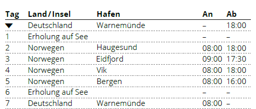 Kreuzfahrt Norwegens Fjorde ab Warnemünde: Warnemünde (Deutschland), Haugesund (Norwegen), Eidfjord (Norwegen), Vik (Norwegen), Bergen (Norwegen), Warnemünde