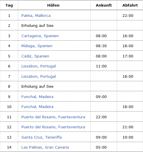 Kreuzfahrt Andalusien, Portugal & Kanaren ab Mallorca: Palma de Mallorca, Cartagena (Spanien), Malaga (Spanien), Cadiz (Spanien), Lissabon (Portugal), Funchal (Madeira), Puerto del Rosario (Fuerteventura), Santa Cruz (Teneriffa), Las Palmas (Gran Canaria)