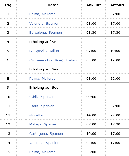 Kreuzfahrt Feiertagsreise durchs Mittelmeer ab Mallorca: Palma de Mallorca, Valencia (Spanien), Barcelona (Spanien), La Spezia (Italien), Civitavecchia (Rom), Palma de Mallorca, Cadiz (Spanien), Gibraltar, Malaga (Spanien), Cartagena (Spanien), Valencia (Spanien), Palma de Mallorca