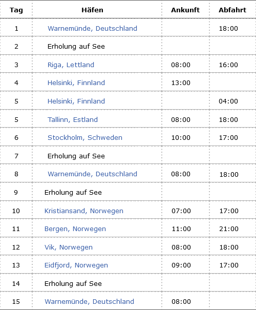 Kreuzfahrt Highlights der Nord- und Ostseeküste 2: Warnemünde, Riga (Lettland), Helsinki (Finnland), Tallinn (Estland), Stockholm (Schweden), Warnemünde, Kristiansand (Norwegen), Bergen (Norwegen), Vik (Norwegen), Eidfjord (Norwegen), Warnemuende