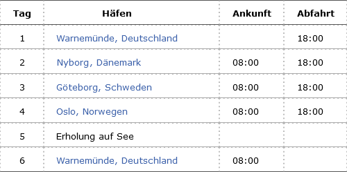 Kreuzfahrt Kurzreise nach Skandinavien ab Warnemünde: Warnemünde, Nyborg (Dänemark), Göteborg (Schweden), Oslo (Norwegen), Warnemünde