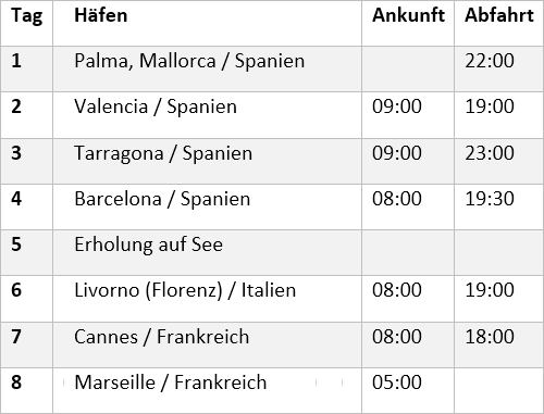 Kreuzfahrt Perlen am Mittelmeer ab Mallorca 2: Palma de Mallorca, Valencia (Spanien), Tarragona (Spanien), Barcelona (Spanien), Livorno (Italien), cannes (Frankreich), Marseille (Frankreich)