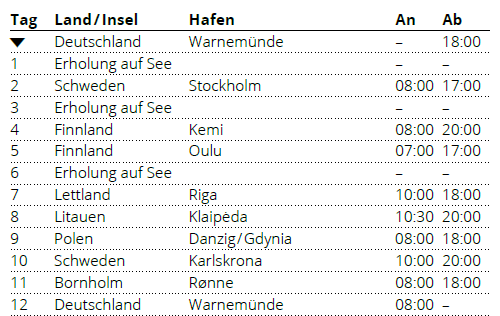 Kreuzfahrt Schärengärten der Ostsee ab Warnemünde: Warnemünde, Stockholm (Schweden), Kemi (Finnland), Oulu (Finnland), Riga (Lettland), Klaipeda (Litauen), Danzig (Polen), Karlskrona (Schweden), Ronne (Insel Bornholm), Warnemünde