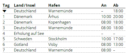Kreuzfahrt Schweden und Dänemark ab Warnemünde: Warnemünde, Arhus (Dänemark), Kopenhagen (Dänemark), Warnemünde, Stockholm (Schweden), Visby (Insel Gotland), Warnemünde
