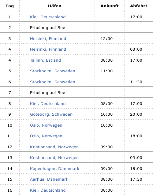 Kreuzfahrt AIDA Feiertagsreise in der Ostsee mit Norwegen: Kiel (Deutschland), Helsinki (Finnland), Tallinn (Estland), Stockholm (Schweden), Kiel (Deutschland), Göteborg (Schweden), Oslo (Norwegen), Kristiansand (Norwegen), Kopenhagen (Dänemark), Arhus (Dänemark), Kiel (Deutschland)