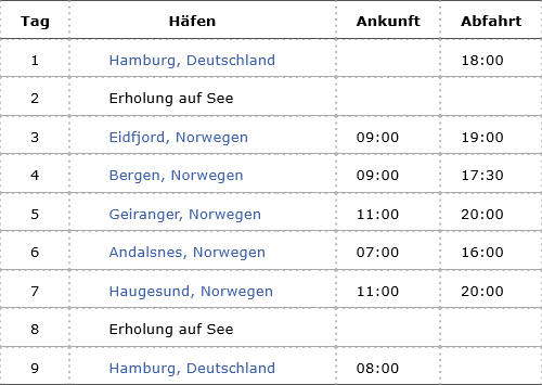 Hier finden Sie eine Übersicht aller Hamburg Kreuzfahrten. |