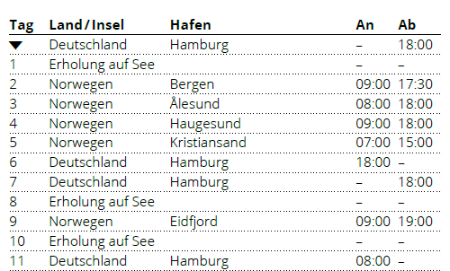 Hier finden Sie eine Übersicht aller Hamburg Kreuzfahrten. |