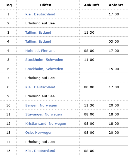 Kreuzfahrt Ostsee & Südnorwegen ab Kiel: Kiel (Deutschland), Tallinn (Estland), Helsinki (Finnland), Stockholm (Schweden), Kiel (Deutschland), Bergen (Norwegen), Stavanger (Norwegen), Kristiansand (Norwegen), Oslo (Norwegen), Kiel (Deutschland)