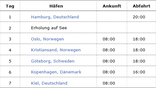 Hier finden Sie eine Übersicht aller Hamburg Kreuzfahrten. |