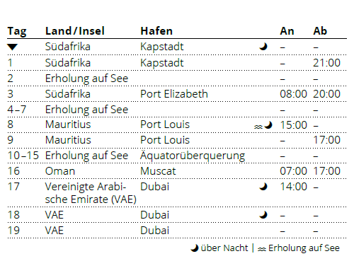 Kreuzfahrt Von Kapstadt über Mauritius nach Dubai 2: Kapstadt (Südafrika), Port Elizabeth (Südafrika), Mauritius, Muscat (Oman), Dubai (VAE)