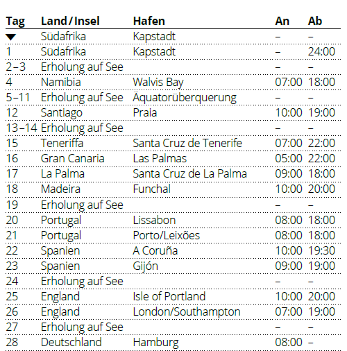 Kreuzfahrt Von Kapstadt über Namibia nach Hamburg: Kapstadt (Südafrika), Walvis Bay (Namibia), Praia (Kapverden), Santa Cruz (Teneriffa), Las Palmas (Gran Canaria), Santa Cruz (La Palma), Funchal (Madeira), Funchal (Madeira), Lissabon (Portugal), Porto (Portugal), La Coruna (Spanien), Gijon (Spanien), Portland (England), Southampton (England), Hamburg