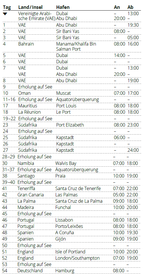 Kreuzfahrt Weltenbummler Orient, Südafrika & Mauritius: Dubai (VAE), Abu Dhabi, Sir Bani Yas (VAE), Manama (Bahrain), Dubai (VAE), Abu Dhabi (VAE), Muscat (Oman), Port Louis (Mauritius), La Reunion, Port Elizabeth (Südafrika), Kapstadt (Südafrika), Walvis Bay (Namibia), Praia (Kapverden), Santa Cruz (Teneriffa), Las Palmas (Gran Canaria), Santa Cruz (La Palma), Funchal (Madeira), Funchal (Madeira), Lissabon (Portugal), Porto (Portugal), La Coruna (Spanien), Gijon (Spanien), Portland (England), Southampton (England), Hamburg
