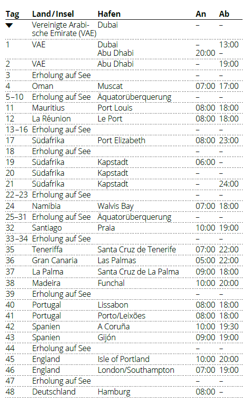 Kreuzfahrt Weltenbummler Südafrika & Mauritius: Dubai (VAE), Abu Dhabi (VAE), Muscat (Oman), Port Louis (Mauritius), La Reunion, Port Elizabeth (Südafrika), Kapstadt (Südafrika), Walvis Bay (Namibia), Praia (Kapverden), Santa Cruz (Teneriffa), Las Palmas (Gran Canaria), Santa Cruz (La Palma), Funchal (Madeira), Funchal (Madeira), Lissabon (Portugal), Porto (Portugal), La Coruna (Spanien), Gijon (Spanien), Portland (England), Southampton (England), Hamburg